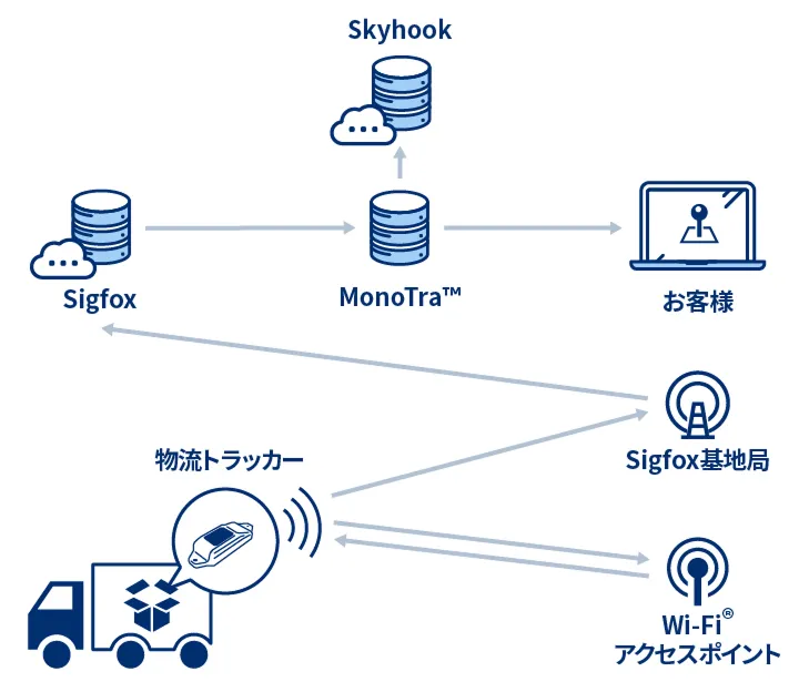 物流資材が置かれる状況の約90%は屋内が占めると言われています。当サービスでは屋内測位に強いWi-Fi®アクセスポイントによる位置情報検出とSigfoxのLPWA(Low Power Wide Area)通信技術を採用。また、世界屈指のロケーションプロバイダーSkyhook Wireless社の精密測位システムを採用したクラウドサービス「MonoTra™」も展開しており、高精度・高効率の検出と通信を実現します。さらにアクセスポイントの追加など、お客様の環境に応じた提案を行います。