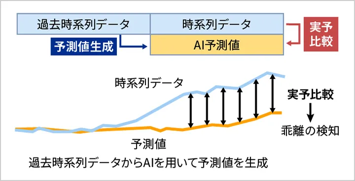 受信した過去時系列データから、随時将来の「予測値」を生成。その後に受信する「時系列データ」と「予測値」を比較。