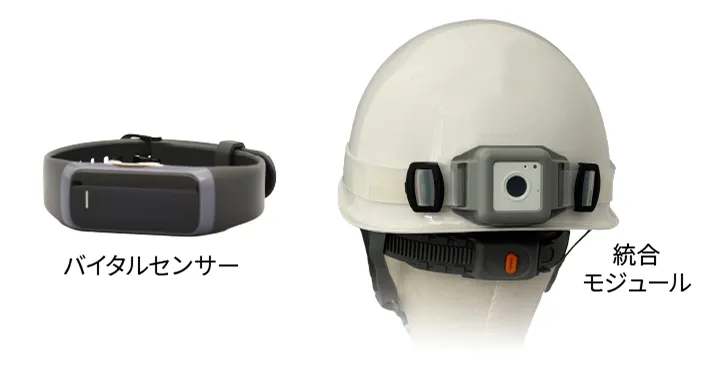 作業者見守りサービスは、現場作業者の安全確保と災害の未然防止を目的としたサービスです。統合モジュールと「手首」又は、「ひたい」に装着したバイタルセンサーから、脈拍・肌温度・気温・湿度・WBGT(暑さ指数)などの情報をリアルタイムで取得。体調変化や墜落・転倒などの異常を検知すると、本人・管理監督者・周辺の作業者へ即時通知し、迅速な対応を促します。