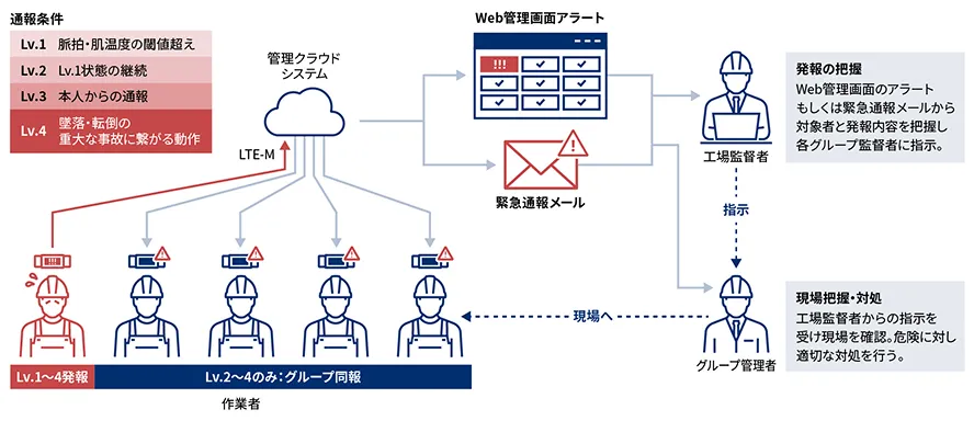 - 作業者の体調変化・墜落や転倒・異常を検知して関係者へ通知