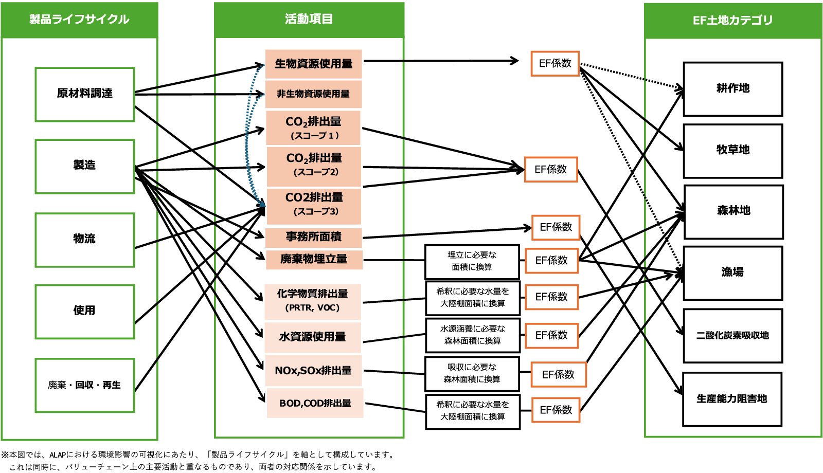 日本国内における事業活動全体を対象とし、製品ライフサイクルの各段階において、当社の事業活動が自然資本のどの機能に依存し、どの様な環境影響を及ぼしているかをビジネスフットプリントとして定量化しました。