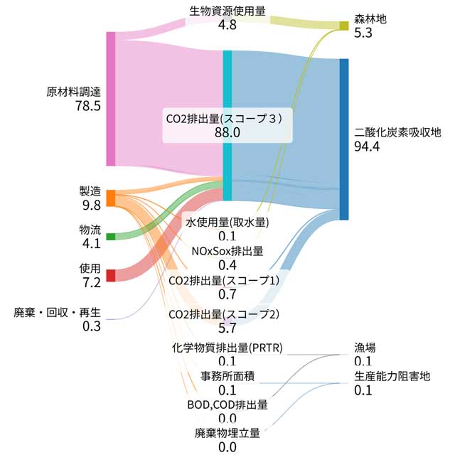 評価指標として採用したエコロジカル・フットプリントは、人間活動による自然資源の消費を土地面積に換算して評価するものであり、ビジネスフットプリントでは、製品ライフサイクルの各段階における当社の事業活動(消費)を6つの土地カテゴリに分別した土地面積に換算します。尚、土地利用ごとの生物生産性は、国や地域によって異なるため、世界平均の生物生産性を測るためにエコフット※2係数を用いています。