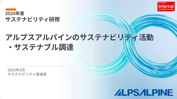 また、事業活動の基本となる5つの経営姿勢(価値の追究、地球との調和、社会への貢献、個の尊重、公正な経営)を軸に、企業・社員として最低限必要な具体的な行動や考え方を明文化した「アルプスアルパイングループ⾏動規範(以下、グループ⾏動規範)」を、全世界のグループ拠点に展開しています。グループ⾏動規範についての研修を定期的に実施し、社員一人ひとりに浸透するよう努めています。