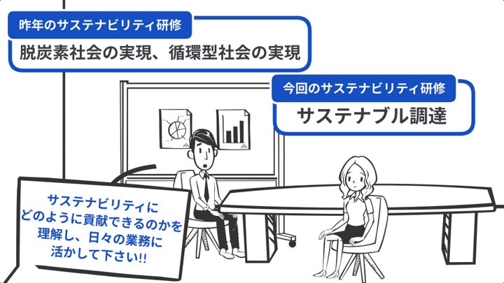 2022年度より、役員および派遣社員を含む国内全従業員を対象に、サステナビリティ研修を実施しています。2024年度は、サステナブル調達について動画での研修を行い、約7,800名が受講しました。また、合わせてアンケートも実施し、サステナビリティの理解度や学びたいテーマなどについて調査を行いました。アンケート結果は2025年度研修の企画に活かす予定です。